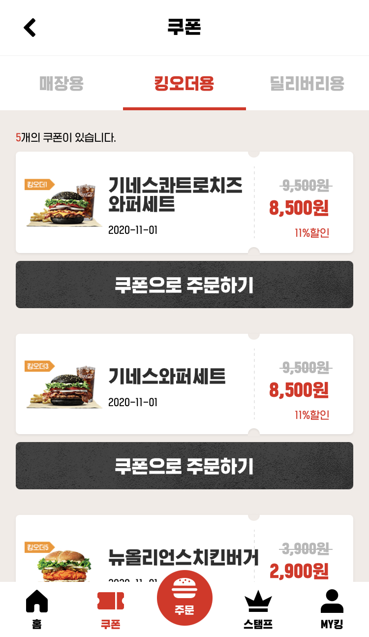 쿠폰 종류 : 모바일 앱 쿠폰 쿠폰 사용처 : 매장, 킹오더, 딜리버리 |